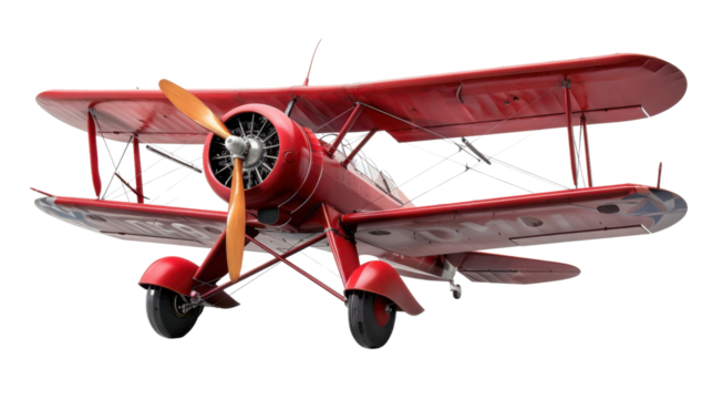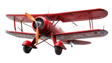 Red biplane toy model bringing vintage aviation and travel concepts, featuring propeller and wings on a transparent background