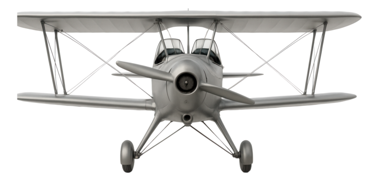 Vintage biplane PNG isolated on transparent background, silver aircraft with red propeller for aviation history and retro design
