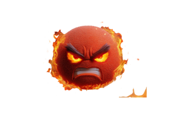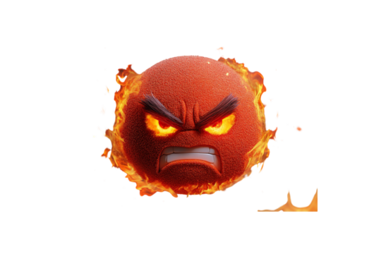 Generate a red emoji with furrowed eyebrows, an intense frown, and flames in the eyes, giving off a strong feeling of anger