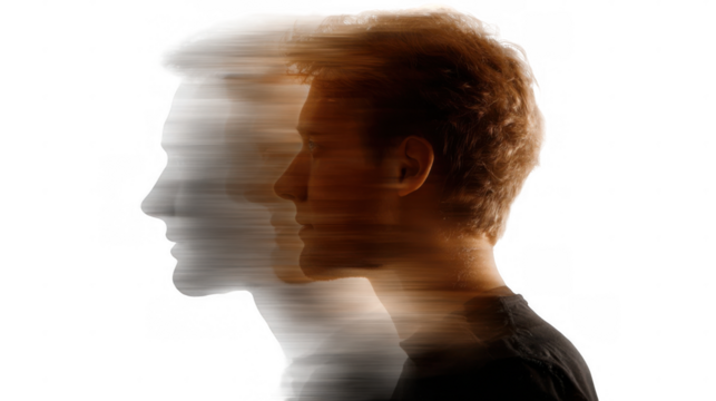 Woman grappling with schizophrenia, experiencing vivid hallucinations and engaging in a heated argument with herself against a transparent background, perfect for creative compositing