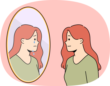 Bipolar disorder in woman smiling but feeling suffering in soul, and looking in mirror. Problems of bipolar disorder in girl seeing crying reflection due to psychological disturbance