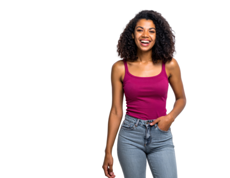Joyful young woman with dark curly hair laughing wearing a magenta tank top and blue jeans posing with her hand in her pocket.