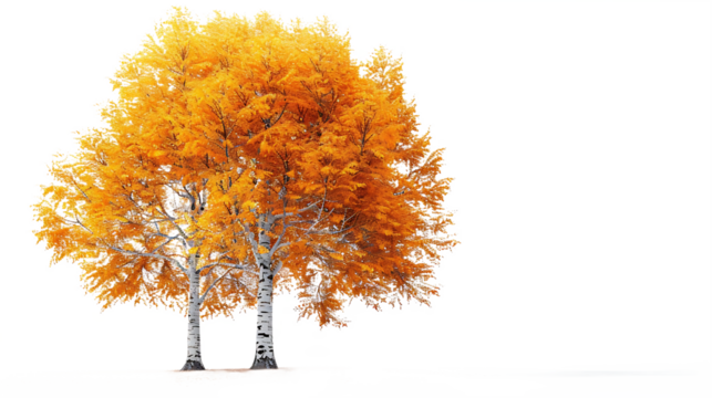 Three distinct birch trees with vibrant autumn foliage showcasing their unique textures and colors isolated on transparent background