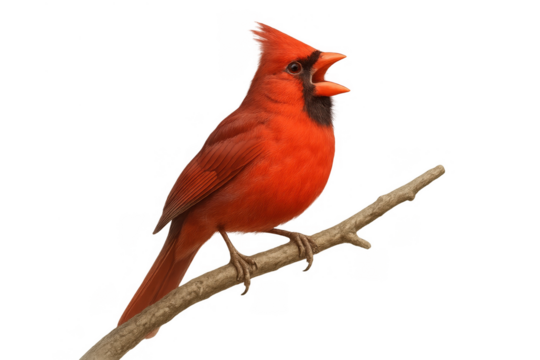 Northern cardinal singing on branch, male red bird perching, wildlife nature birdwatching, isolated transparent background element