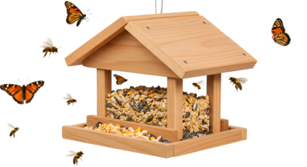 A wooden bird feeder filled with seeds, surrounded by butterflies in a sunny garden, attracting wildlife and nature lovers