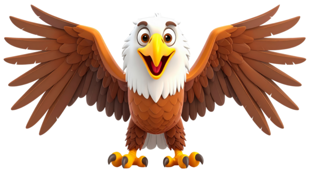Friendly 3D cartoon eagle character with widespread wings smiling, isolated on a clean background