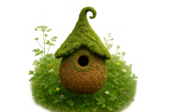 Whimsical fairy garden birdhouse creating a magical home for birds and nature, transparent background