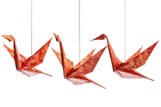 Three origami cranes made of red paper with gold patterns hanging on strings