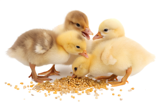 Ultra realistic baby farm animals group, ducklings and chicks eating small grains together, cute but realistic appearance, soft fluffy feathers, gentle natural behavior, tiny beaks pecking grain, smal