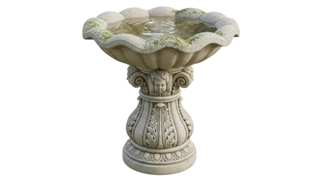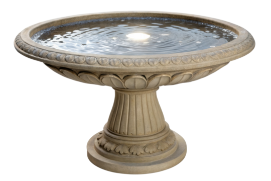 A birdbath with intricate stone carving and shallow water, isolated on Transparent background