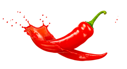 A red chili pepper with a splash of red liquid on a black background in a studio shot image style