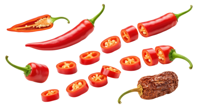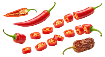 Bright red chili peppers arranged whole, halved, and sliced into rounds showing seeds, plus a single wrinkled dried chili, on a transparent background