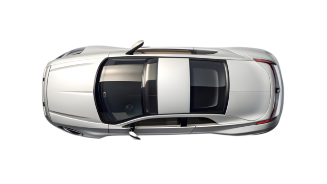 Overhead view of a sleek, silver sedan with a black roof, showcasing its design and features from a bird's-eye perspective against a stark black background.