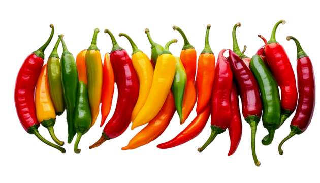 Assortment colorful chili peppers displayed vividly on a clean white background showcasing variety, freshness, texture, shapes, sizes, and vibrant hues. Perfect for cooking, decoration, culinary arts,