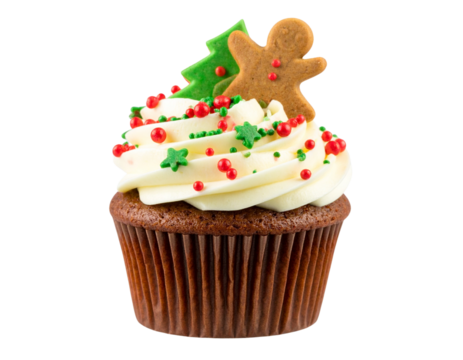 Gingerbread-Themed Christmas Cupcake with Brown Frosting and Cookie Topper, Cozy Holiday Style, PNG