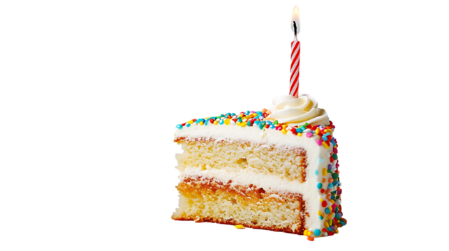 Slice of delicious birthday cake with candle on transparent background