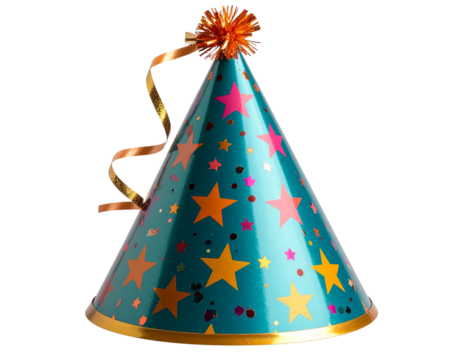 Colorful cone-shaped party hat, isolated on transparent background, bright festive tone.