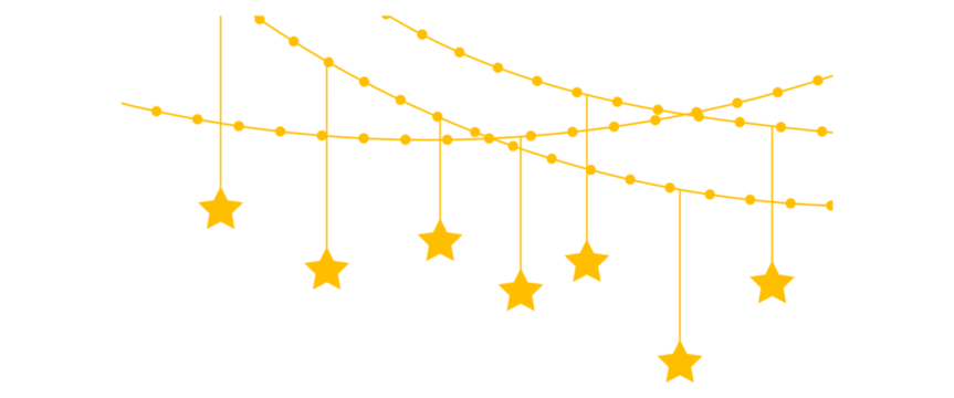Festive PNG banner with shiny gold bunting, stars, garlands. Perfect for New Year, birthday or Christmas party decoration, luxury celebration, or invitation overlay