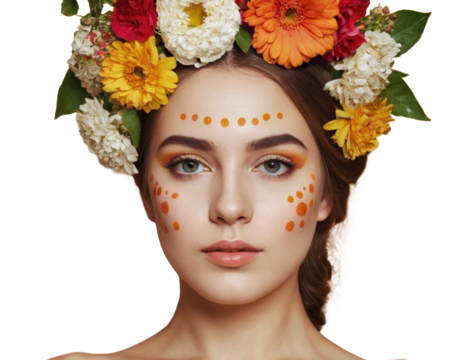 Beautiful woman adorned with colorful floral crown and artistic orange makeup celebrating nature and beauty