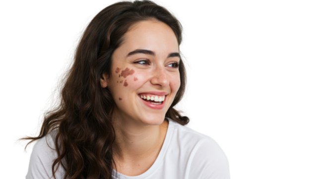 Smiling young woman with facial birthmarks on white background