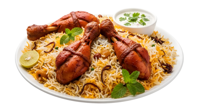 Delicious chicken biryani with salad and raita isolated on transparent background