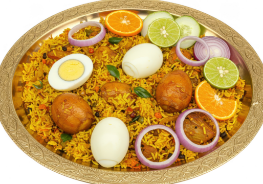 Close up of a biryani dish with eggs onions and citrus fruits on a decorative golden plate on transparent background