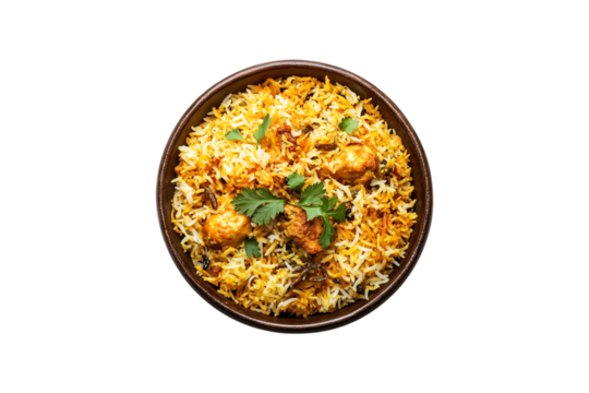 Delicious and flavorful chicken biryani served in a rustic wooden bowl on transparent background