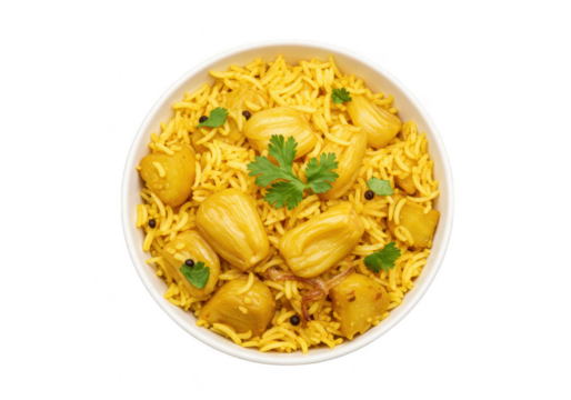 Top view of A bowl of jackfruit biryani garnished with fresh coriander with jackfruit chunks isolated on transparent background