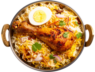 Top View of Hyderabadi Biryani in Ornate Brass Bowl with Boiled Egg and Saffron Rice – Transparent PNG
