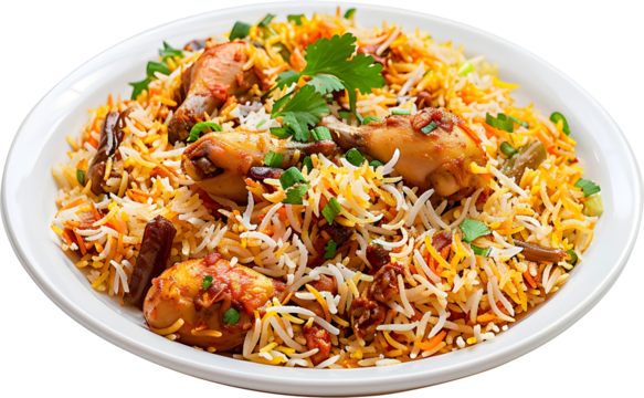 Delicious chicken biryani with garnish isolated on transparent background