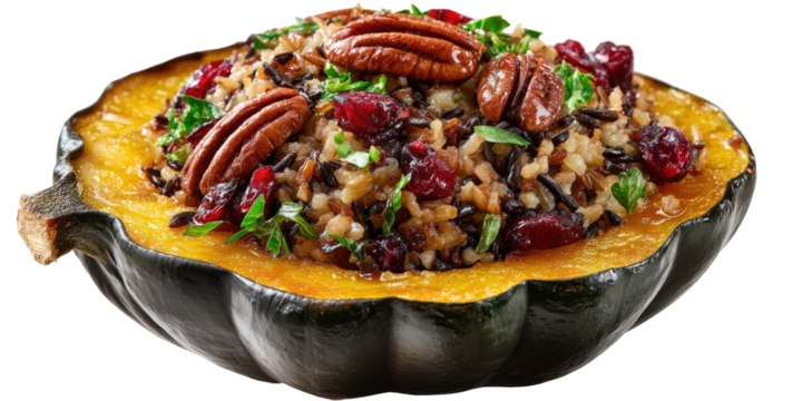 A close-up shot of a halved squash filled with a wild rice mix, cranberries and pecans