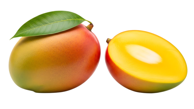 Whole and halved ripe mango with green leaf on dark background isolated on a transparent background