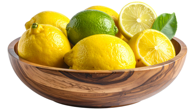 Wooden bowl overflowing with ripe yellow lemons and a green lime, some halved