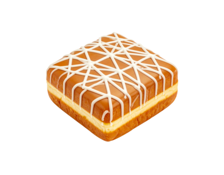Square caramelglazed donut with a decorative white icing web pattern showing a creamfilled layer.