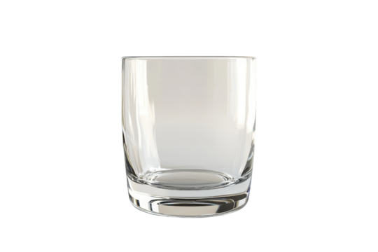 Crystal clear empty glass tumbler suitable for beverages. Perfect for showcasing drinks in ads, menus, and promotional materials.