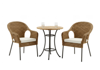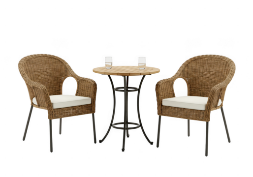 Wicker bistro set with two chairs and a table with drinks isolated on transparent background