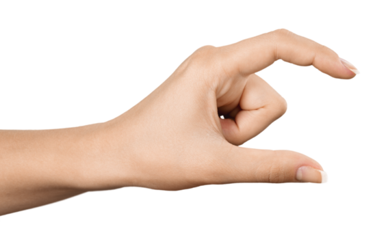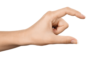 Hand holding a little bit of something, isolated on white background. Gesture indicating a pinch or small grasp, ideal for interaction and communication concepts. Close up view, transparent PNG