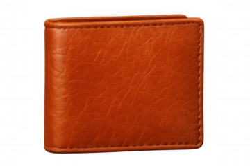 Closed orange leather wallet isolated on transparent background, ideal for mockups and compositions