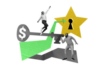 Creative poster collage of two funny dancing man woman key opening lock money achieve goal trader financier economist dollar sign