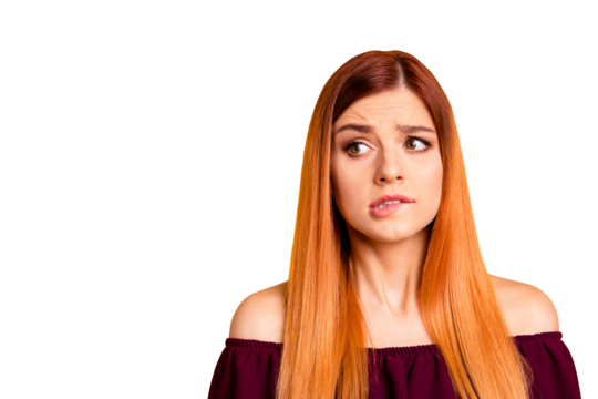 Portrait of cocky evil angry aloof luxury chic attractive adorable gorgeous charming wavy-haired lady biting forefinger isolated over pink background