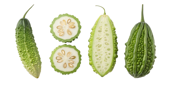 Bitter Melon Composition Whole, Halved and Sliced, Isolated on Transparent Background, Gourd, Vegetable, Bitter Melon, Healthy Food, Asian Cuisine