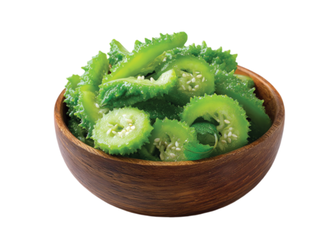 Bitter gourd Sliced wooden bowl isolated on transparent or white background