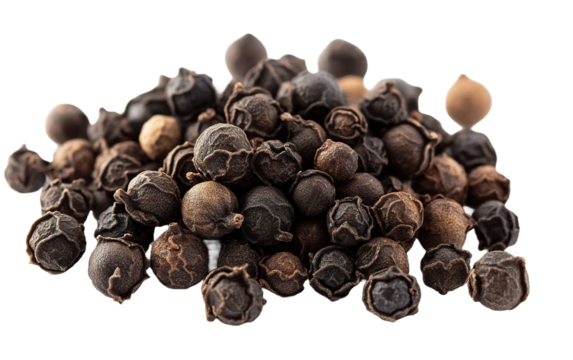 A small pile of dark brown and black peppercorns, round and wrinkled,  showing varied shades and textures against a black background