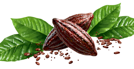 cacao lesbians, green leaves, and chocolate beans on a transparent background