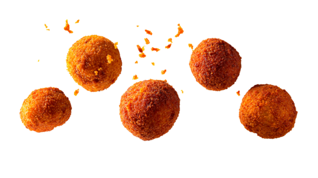 Seven savory, deep-fried, meat-based snacks, known as bitterballen, resting on a clean white plate, isolated on a transparent background