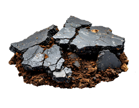 Broken asphalt pavement chunks with cracked road surface and exposed dirt soil rubble debris close up texture on isolated background
