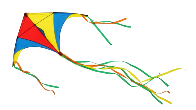 Colorful diamond kite PNG isolated on transparent background, red yellow blue kite with streamers for outdoor fun and childhood memories