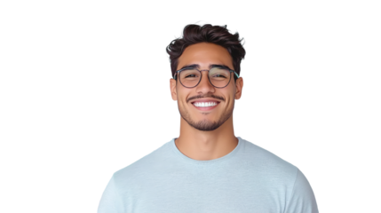 Smiling young man wearing glasses, casual attire, friendly expression, isolated on a white background.