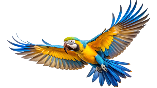 Photo of blue and yellow macaw parrot flying with wings spread, isolated on transparent background