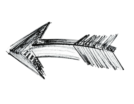 Hand-drawn, black and white arrow pointing left against a transparent background